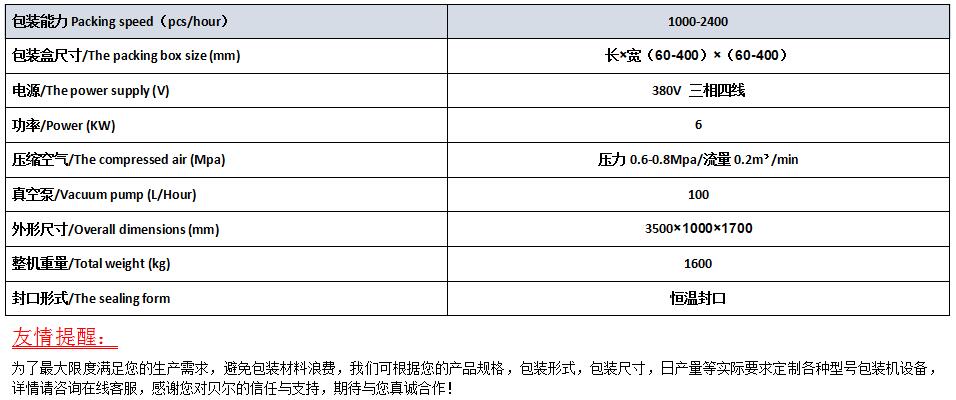 一、產品簡介 作為氣調包裝機廠家,盒式全自動氣調保鮮包裝機是我廠2002年開發的產品,經過十六年的研發與完善,,該機能夠自動落盒,將塑料盒準確落入模具中,自動打印生產日期及批號,自動抽真空后充入N2、02、CO2單一氣體或混合氣體。貝爾盒式包裝機以其成熟技術,高端原裝進口主機配件,高效使用性能,