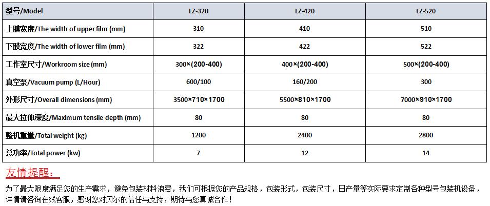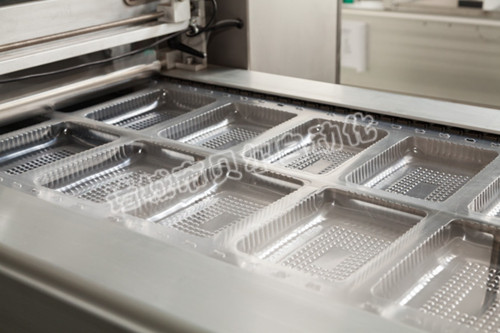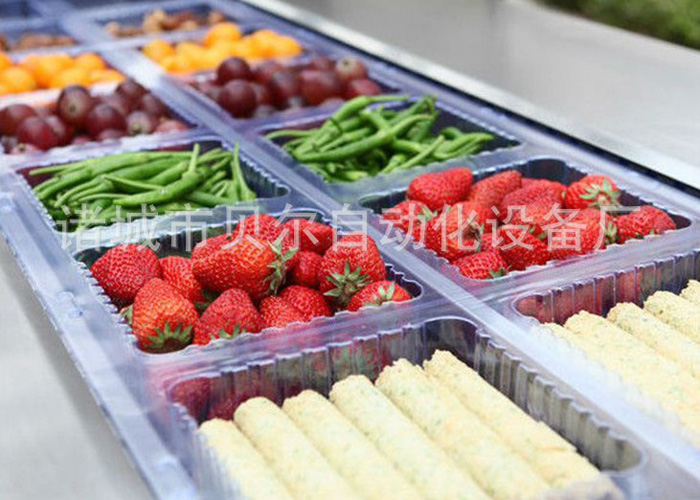 二、應用范圍 熱成型氣調包裝機廣泛用于生熟肉、禽、魚以及果蔬等休閑食品,面包、糕點和盒飯等食品的盒式包裝和袋式包裝,它利用CO2、O2、N2等保護性混合氣體所起的不同作用,有效抑制微生物生長繁殖。經過氣調包裝的食品,較好地保持了食品原有的口感、色澤、形狀及營養,同時可達到較長的保鮮期。 三、性能特點及原理 (1)本機適合各式食品的盒式包裝,連續自動完成抽真空、自動混合保鮮氣體(通常為CO2、N2、O2)、充氣、封口包裝、分切,包裝成品排出等步驟; (2)可完成復合膜、單膜、共擠膜等不同材質的包裝膜和包裝盒進行封口包裝; (3)伺服電機驅動,由可編程序控制器(PLC)配合觸摸屏實現人機界面對話,各部分動作及控制參數均可由PLC設定、修改??刂品奖憧煽?,精確靈活,故障率低; (4)整體式鋁合金側板支架(貝爾國家專利號ZL2004 2 0039098 3),強度高,直線度好,主體采用SUS304食品級不銹鋼材料制造,設備表面易清洗; (5)封口壓力、溫度和時間等參數可以精確控制,確保產品封口達到理想效果; (6)光電跟蹤蓋膜圖案,確保包裝印刷圖案的完整; (7)模具形狀可按客戶選定的包裝盒樣式進行定制; 四、主要技術參數 見附件