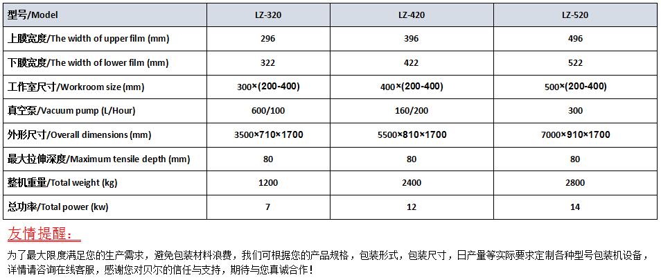 貝爾全自動拉伸膜包裝機能夠自動制袋,自動打印生產日期及批號,自動真空包裝,真正實現自動化包裝,包裝袋應用規格廣泛,長度范圍:60-460mm,寬度范圍:60-600mm,包裝效率每小時1000-15000袋,通過更換不同的上料系統,可以對液體,膏體,粉末,塊狀等不同的物料進行自動定量包裝,實現一機多用,高效智能,產品主要規格有LZ320型,LZ420型,LZ520型,同時可根據客戶產品規格量身定制設備,以達到提升產能,避免物料浪費,節約生產成本的目的。
